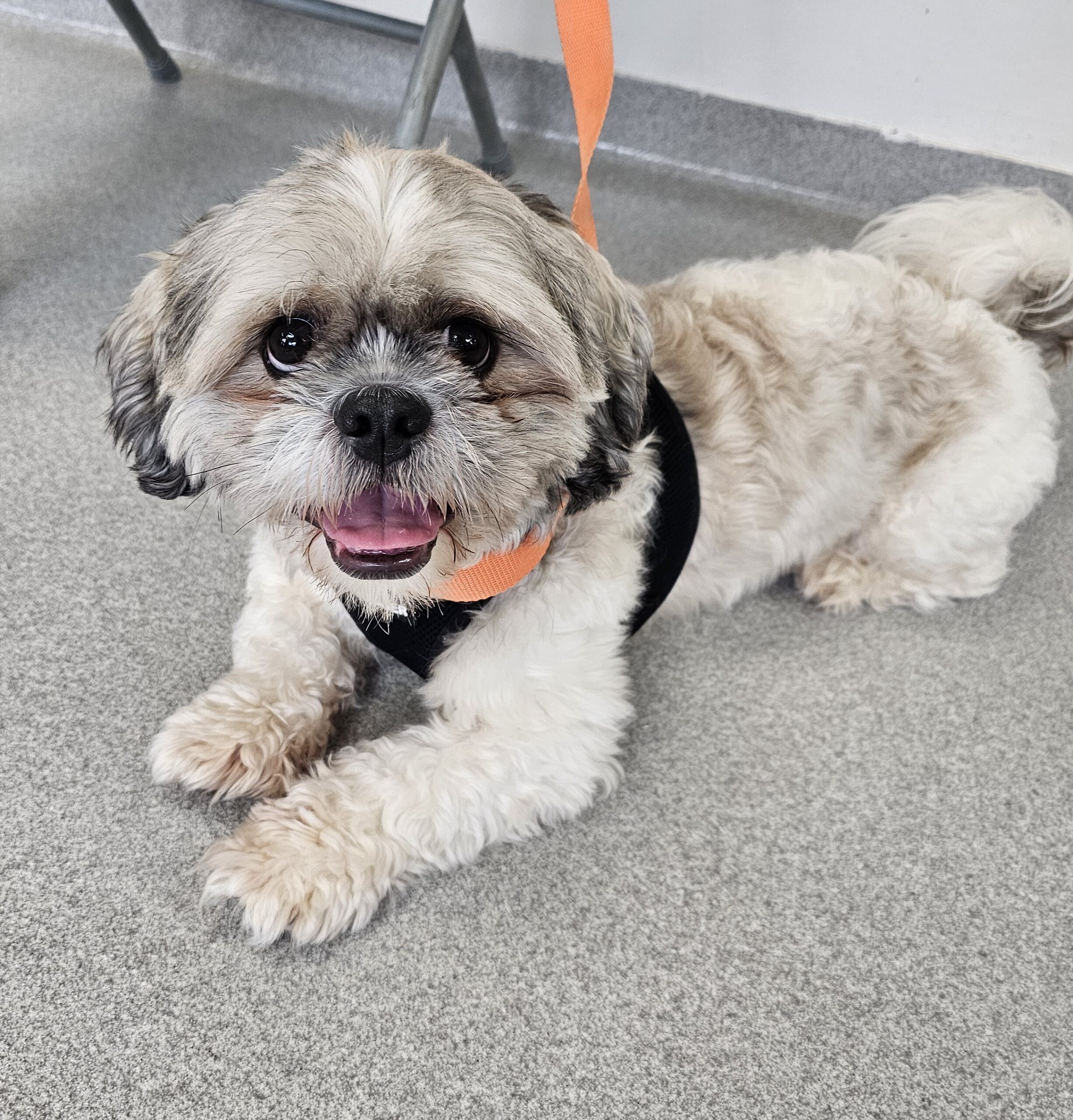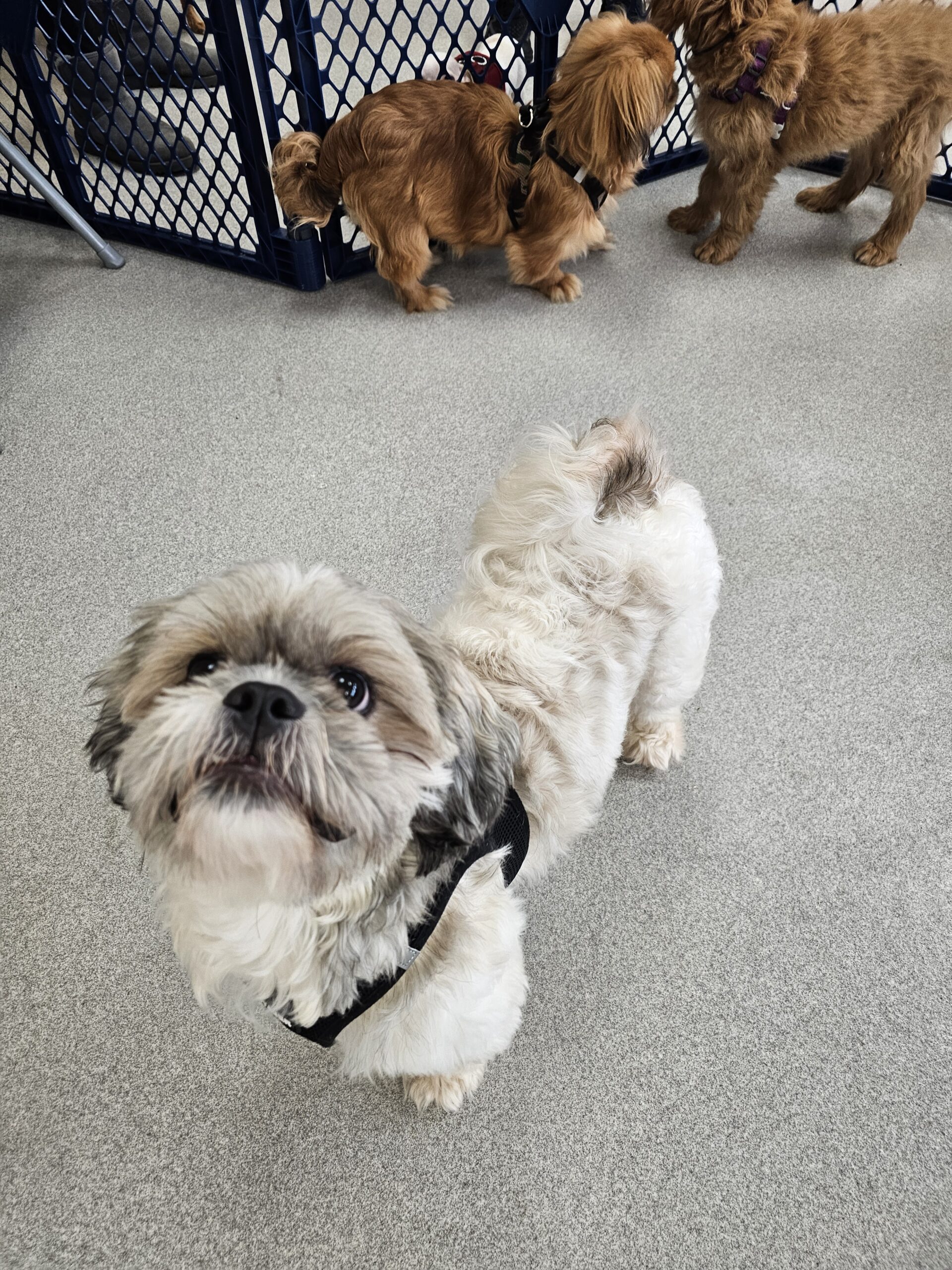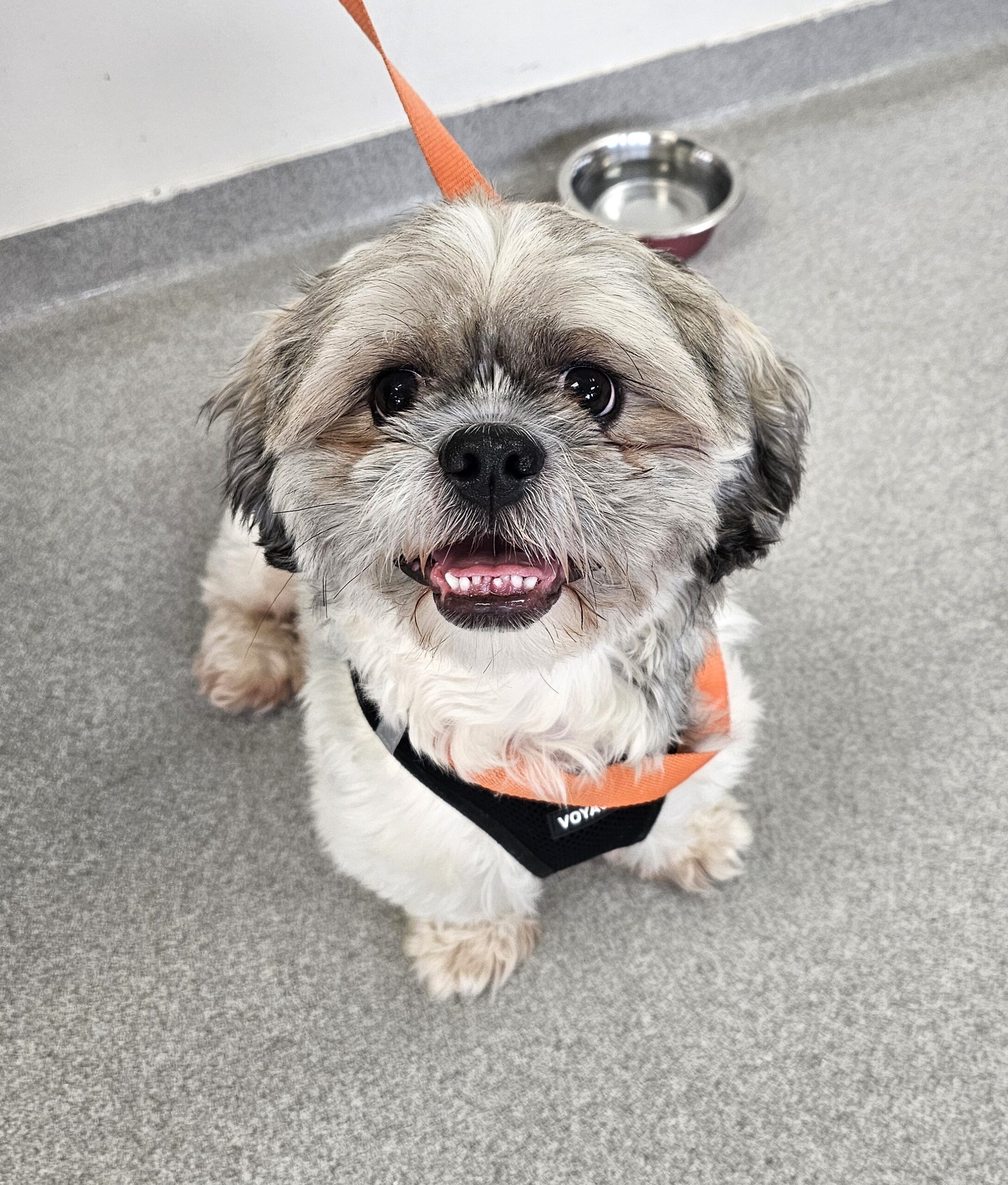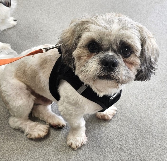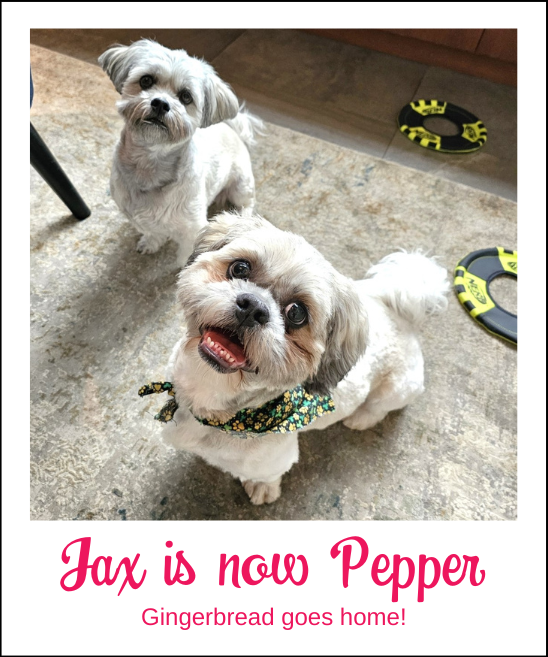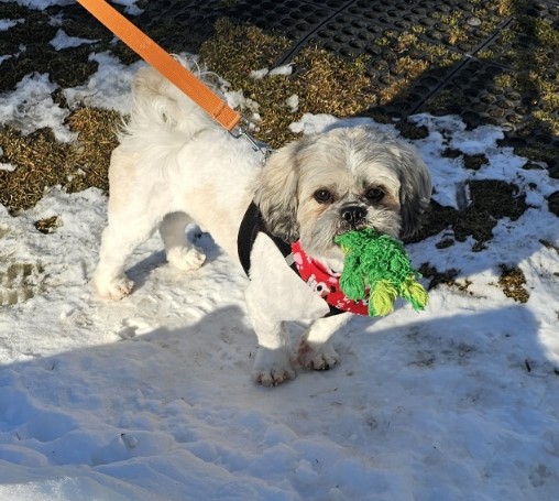 Jax is three years old, white and gray, around 18 lbs., and likely a Shih Tzu – Havanese mix.