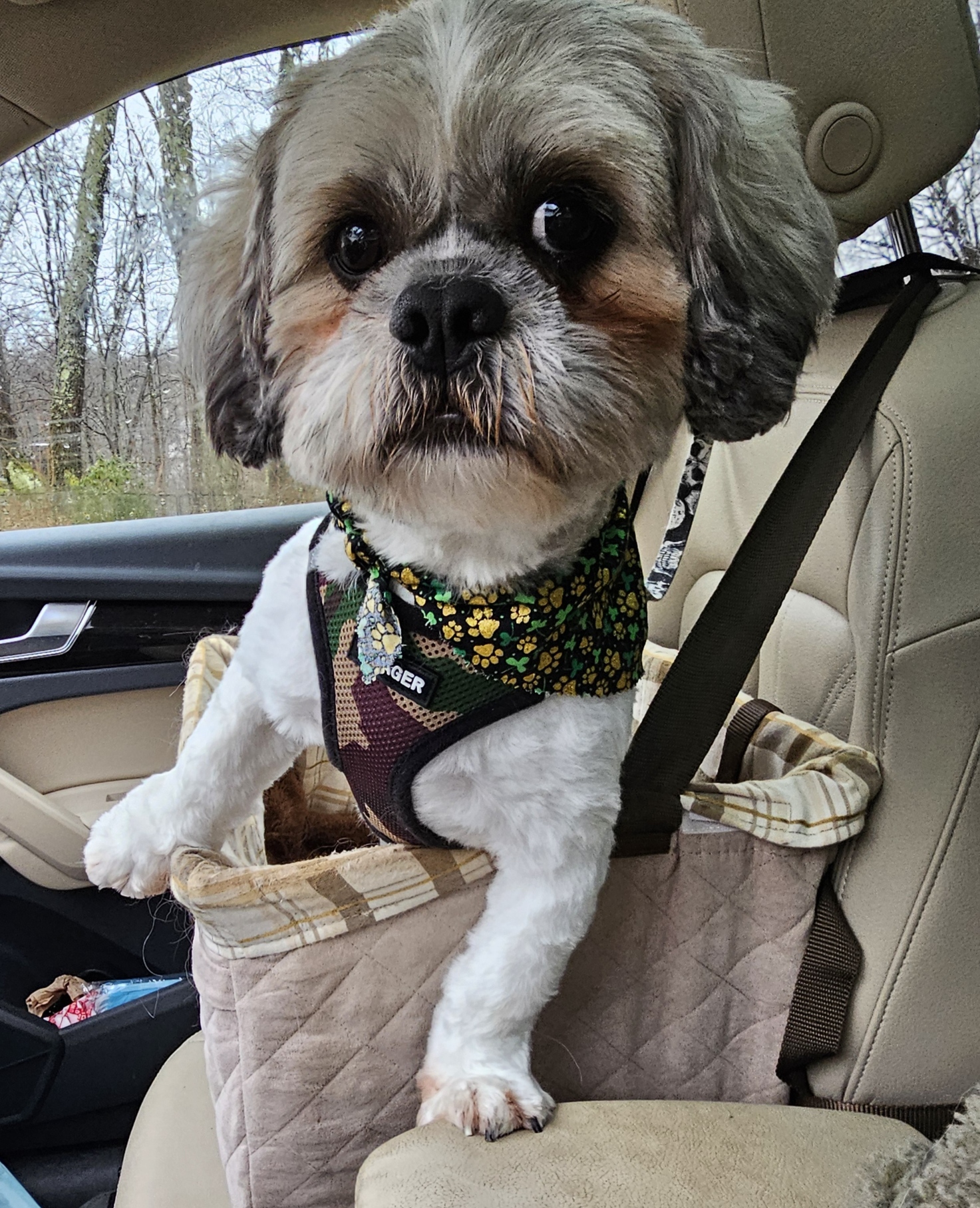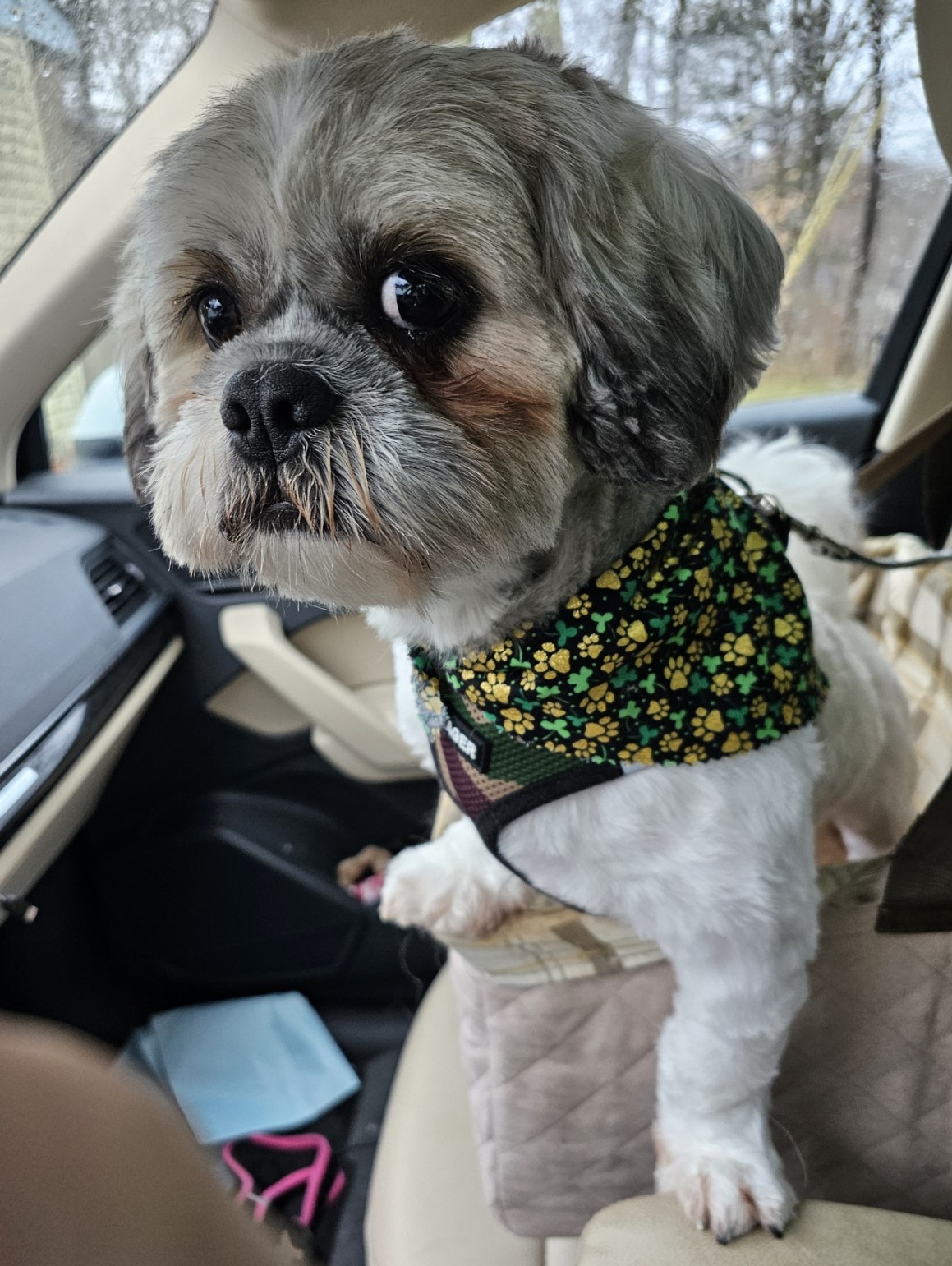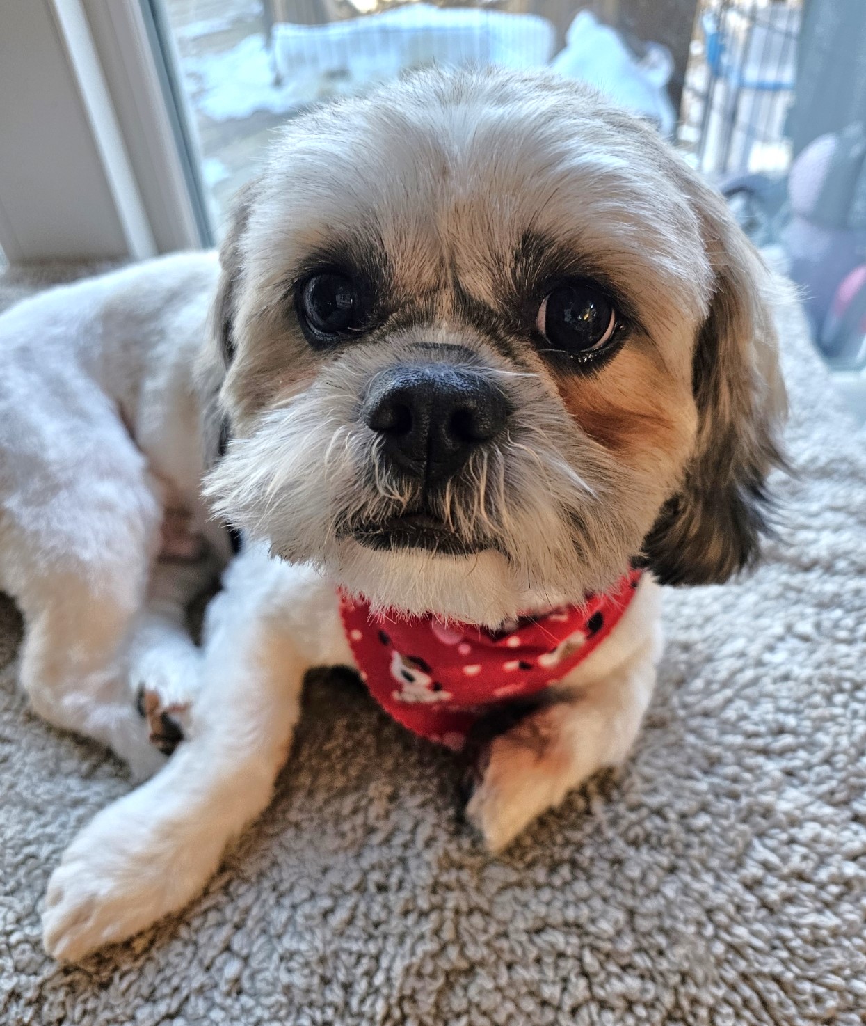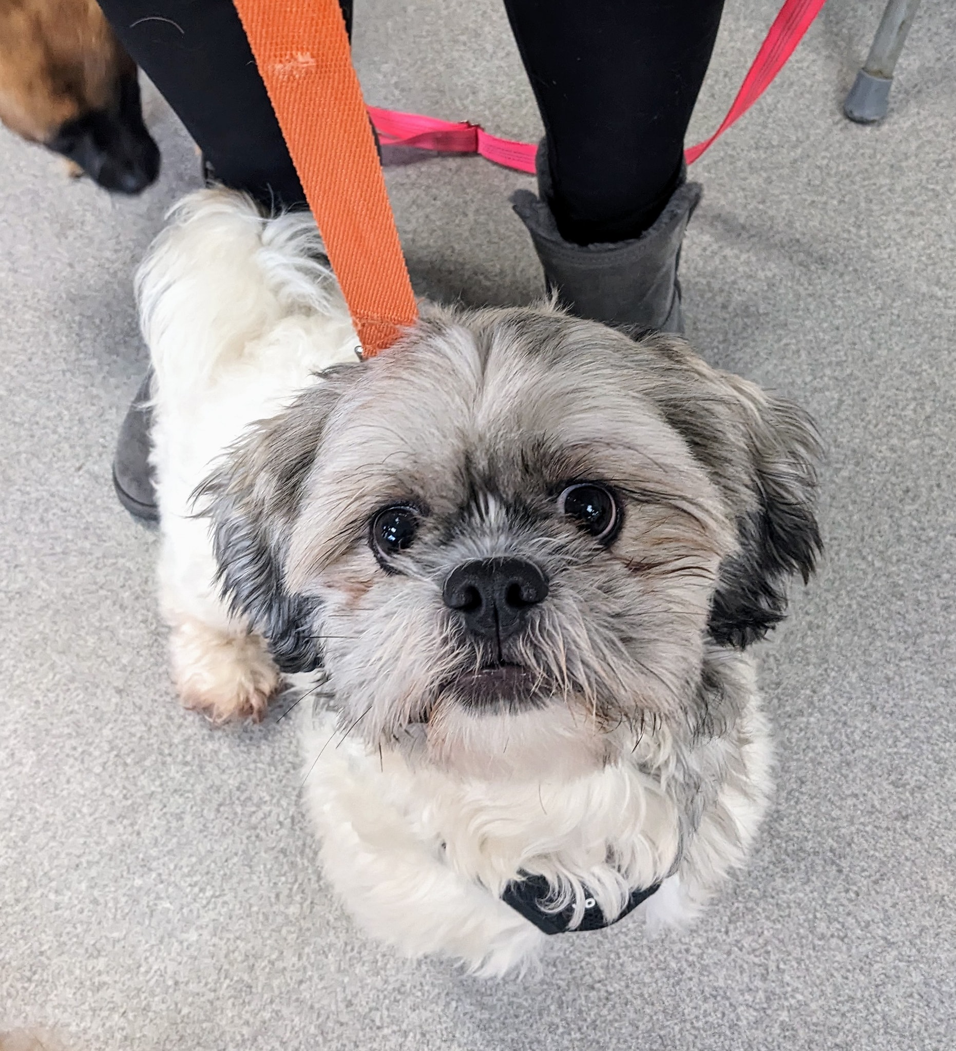 Jax is three years old, white and gray, around 18 lbs., and likely a Shih Tzu – Havanese mix.